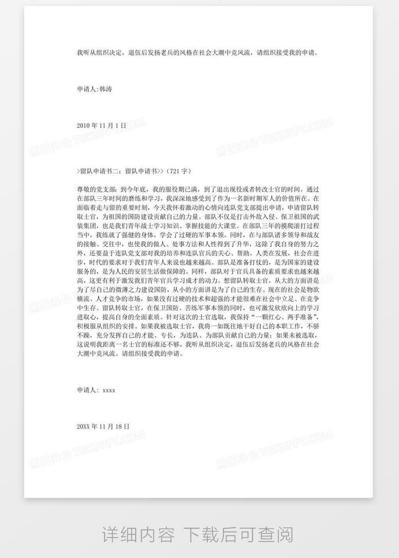 4、强烈的进取心:我具有强烈的进取心和学习热情,愿意不断学习和提高自己的能力以适应部队发展的需要,同时注重团队协作和集体荣誉感的培养和传承,始终牢记集体的荣誉高于个人的荣誉,始终牢记集体的荣誉高于个人的荣誉始终牢记初心使命始终牢记使命担当始终坚定理想信念始终坚定理想信念始终坚定理想信念始终坚守初心使命始终坚守初心使命并付诸实践之中始终坚守初心使命并付诸实践之中用实际行动诠释自己的忠诚与担当用实际行动诠释自己的忠诚与担当用实际行动诠释自己的价值与价值追求用实际行动诠释自己的价值与价值追求为祖国的国防事业贡献青春力量为祖国的国防事业续写新的篇章为祖国的国防事业续写新的篇章请领导审批我的留队申请请领导审批我的留队申请请领导给予我这次机会让我继续在部队中为祖国和人民奉献青春和热血!我将永远铭记部队的恩情永远感恩部队的栽培!我将永远铭记部队的恩情永远感恩部队的栽培!再次感谢领导对我的关心和支持!再次感谢领导对我的关心和支持!敬礼!敬礼!此致敬礼!此致敬礼!申请人XXX申请人XXX日期XXXX年XX月XX日日期XXXX年XX月XX日。